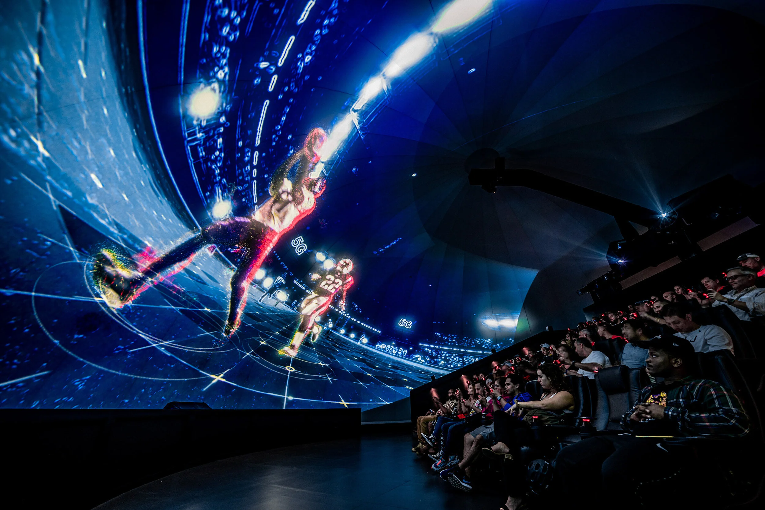 We secured the Miami Dolphins Hard Rock Stadium as our backdrop for this content experience. Our goal was to take guests on a ride that descended down from the heavens and placed them right in the middle of the action. Shooting on the RED Monstro with the Entinya HAL 250, we were able to Shoot in 8K with a field of view above 220 degrees. This setup allowed us to get inches away from the players, making them appear as giants, but unlike a 360 camera, eliminate all stitching issues. Adding to the sensory experience, we wanted to lean on one of the strengths of dome projections: their ability to simulate motion. To do so, we incorporated a drone rig to fly the drone in and out of the stadium, as well as hooked our camera onto a Techno-crane, allowing for smooth yet dynamic moves during gameplay.